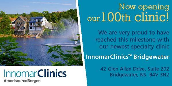 Innomar Strategies est fier d'annoncer l'ouverture de la 100e CliniqueInnomarMC à Bridgewater, en Nouvelle-Écosse. L'ouverture de cette clinique signifie une étape importante vers l'objectif d’Innomar de fournir un soutien clinique et des soins infirmiers de haute qualité à tous les Canadiens. Le réseau de CliniquesInnomar et son équipe de soins infirmiers va continuer à croître pour que tous les patients aient un accès commode à un niveau élevé de soins.