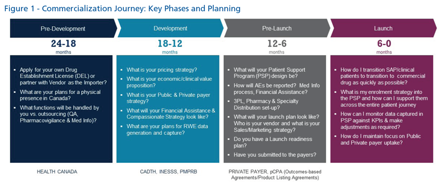 Looking at the commercialization journey holistically, Sandra Anderson from Innomar Strategies summarized the perspectives, proactive planning requirements, and considerations for manufacturers for their product launches. She also highlighted the key phases and planning required (Figure 1) during each stage while focusing on the keys to successful commercialization in Canada.