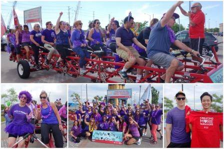 On the day of the event, each team had a chance to climb aboard the massive bike built for 30 to celebrate their fundraising efforts by peddling along a two kilometer journey.